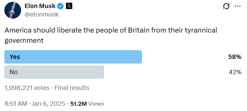 But perhaps his most interesting post was a poll, asking his 234 million followers the following question: “America should liberate the people of Britain from their tyrannical government.” It was a yes/no question to which 58% of his respondents answered in the affirmative.