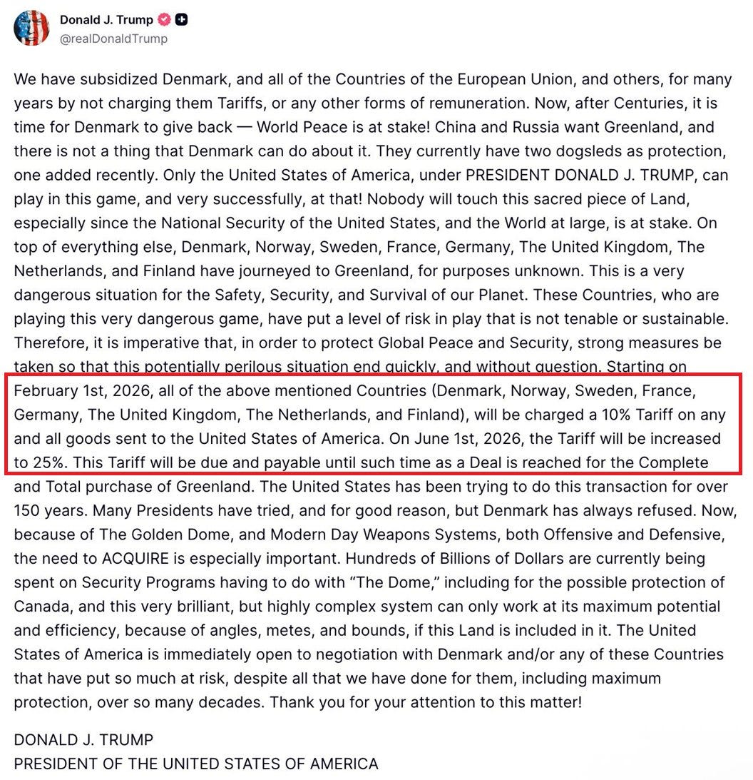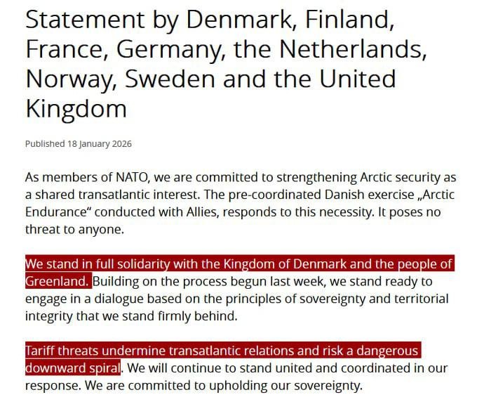 “As members of NATO, we are committed to strengthening Arctic security as a shared transatlantic interest. The pre-coordinated Danish exercise ‘Arctic Endurance’ conducted with Allies … poses no threat to anyone. We stand in full solidarity with the Kingdom of Denmark and the people of Greenland. … we stand ready to engage in a dialogue … Tariff threats undermine transatlantic relations … We will continue to stand united, bla, bla, bla.. our sovereignty.”