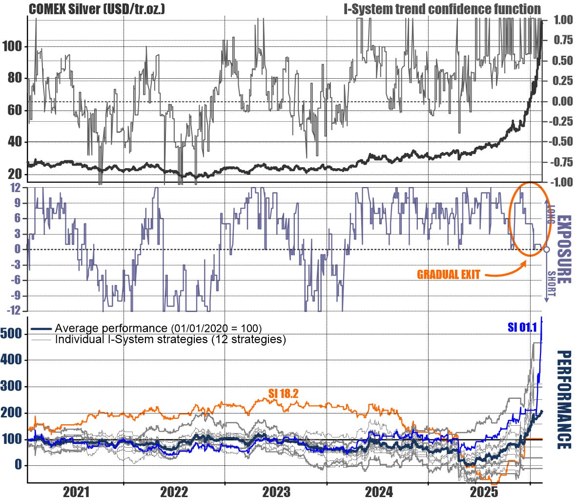 In the bottom panel, showing the trading performance of the 12 I-System strategies for silver included in our Major Markets portfolio, I highlighted two strategies: SI 01.1 and SI 18.2 (again, there is nothing of significance to those names - they’re just codes to distinguish them). As we can see, the SI 01.1 strategy is our best performance while SI 18.2 is among the laggards.