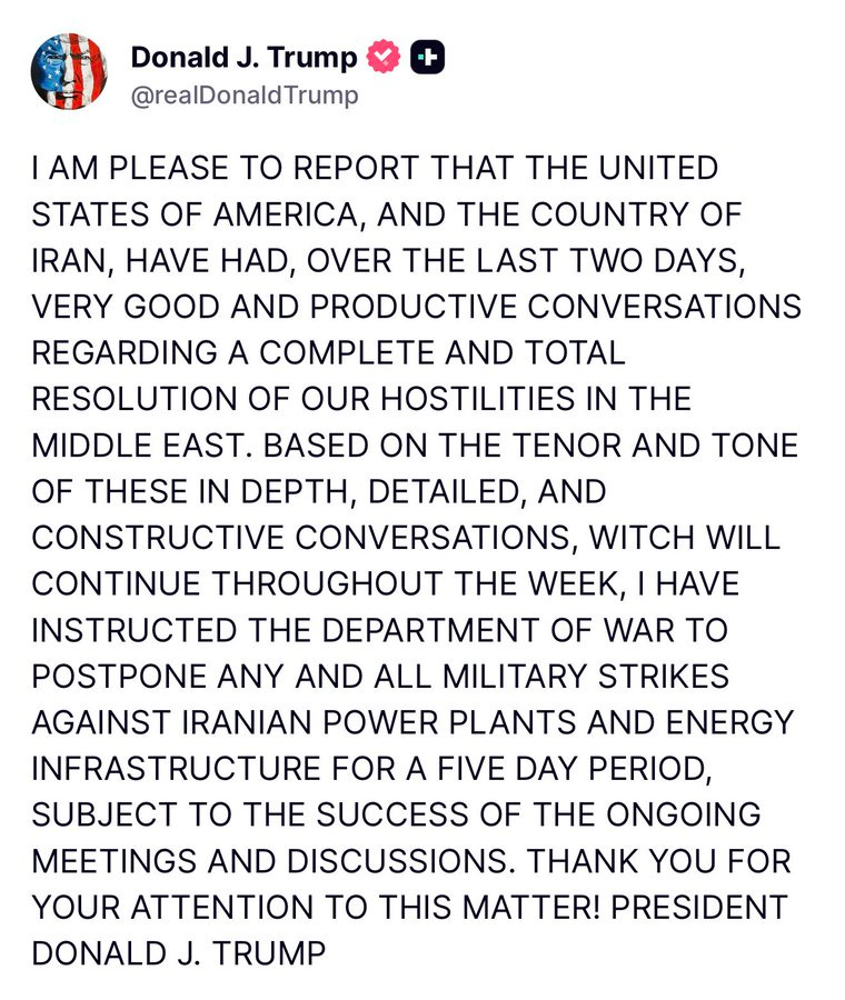 Then today, Trump may finally have blinked: he announced “very good and productive conversations” with Iran over the prior two days toward a “complete and total resolution of hostilities.” He postponed any strikes on Iranian power plants and energy infrastructure for five days, pending ongoing talks. This led to market relief (e.g., oil prices dropping sharply and U.S. equity futures rising).