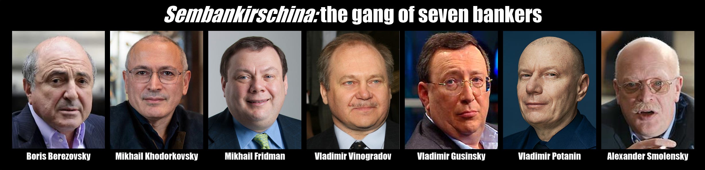 In modern times, the full pathogenicity of oligarchic rule was exemplified in Russia during the 1990s. When the Soviet Union collapsed in 1991, Russia began its transition from a communist dictatorship to a western-style democracy. But behind the façade of democracy, the real power was usurped by a small group of oligarchs, most powerful of whom was the Sembankirschina, the gang of seven bankers, all of whom were trustees of western financial interests. The seven and the companies they controlled were: